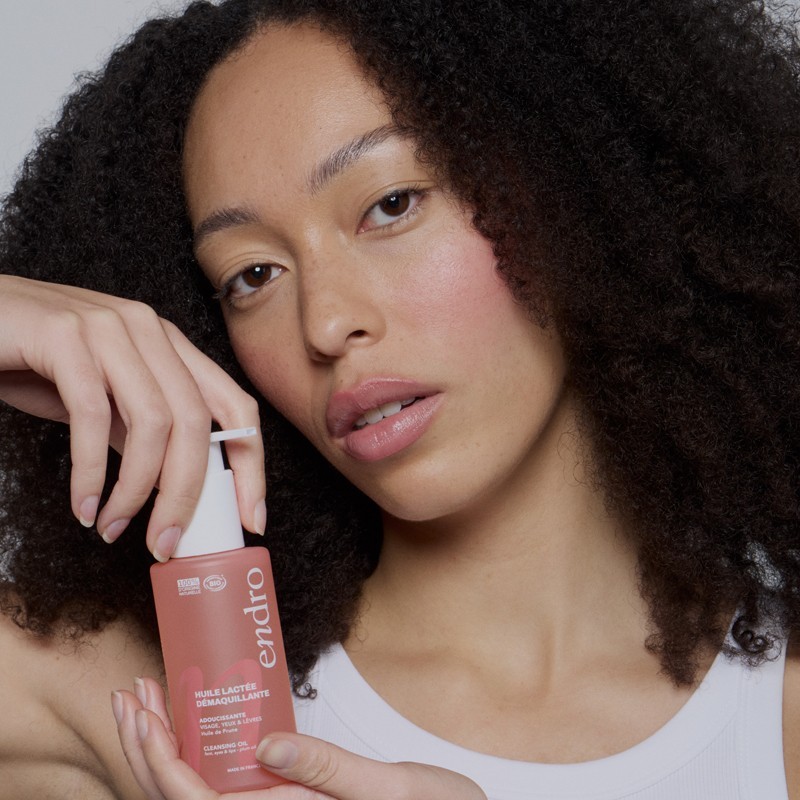 Olio latte detergente e struccante Endro Cosmétiques con oli bio di prugna e girasole di origine francese. Rimuove trucco e impurità in profondità, anche il make-up resistente all'acqua, trasformandosi in latte al contatto con l'acqua. Senza profumo, per tutti i tipi di pelle. 84% ingredienti biologici. Best-seller della gamma.
