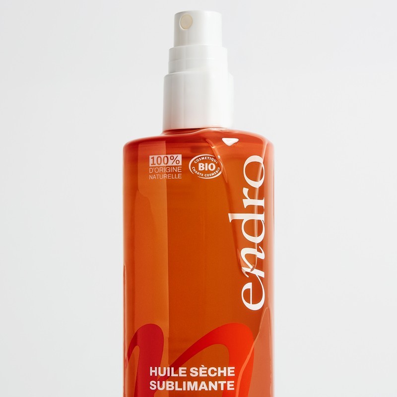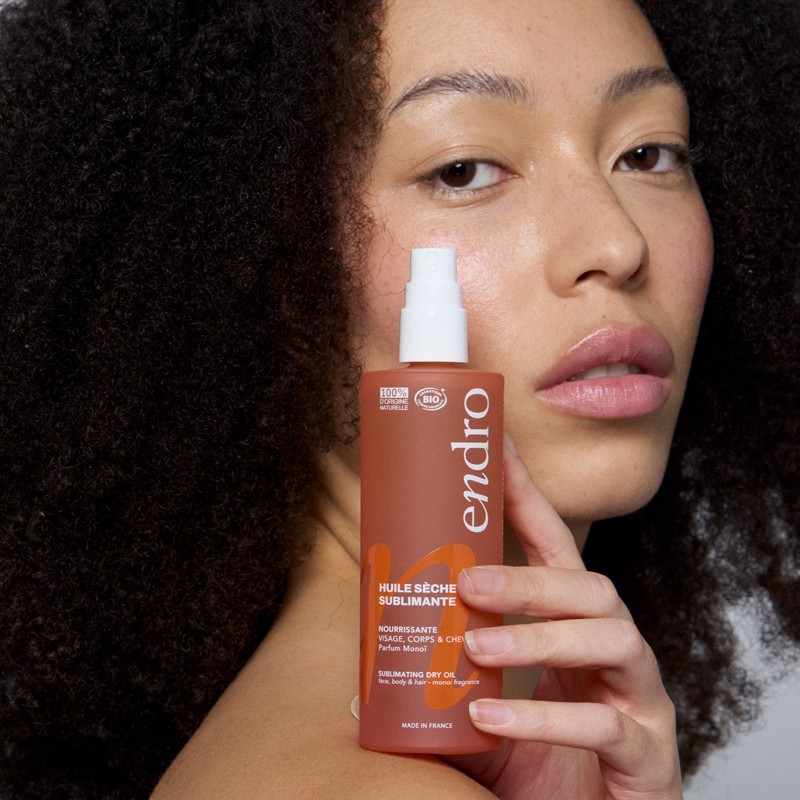 Olio secco 3 in 1 Endro Cosmétiques al profumo di Monoï con oli bio di girasole, nocciola e canapa. Nutre e rigenera pelle, capelli e barba senza effetto grasso, con finish satinato dry-touch. Formula 100% naturale. Certificato COSMOS ORGANIC. Flacone in vetro con erogatore.