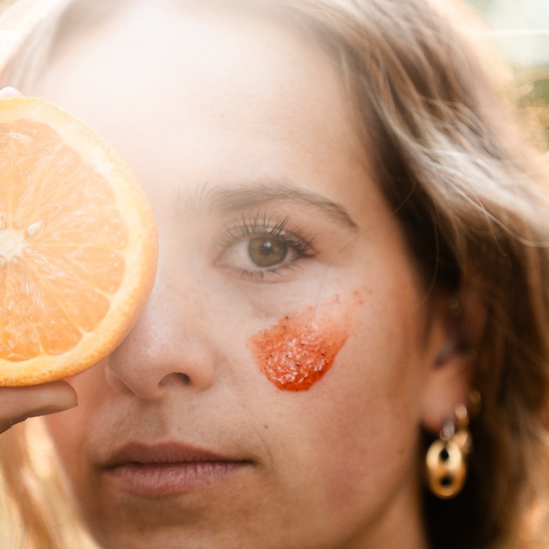 INCI: Aqua, Propylene Glycol, Glycerin, Citrus Sinensis Peel Powder*, Pentylene Glycol, Prunus Persica Seed Powder, Xanthan Gum, Lactobacillus/Punica Granatum Fruit Ferment Extract, Heptyl Glucoside, Caprylyl Glycol, Decyl Glucoside, Aloe Barbadensis Leaf Juice Powder*, Tocopherol, Haematococcus Pluvialis Extract*, Citrus Paradisi Fruit Extract, Leuconostoc/Radish Root Ferment Filtrate, Parfum, Citric Acid, Sodium Hydroxide, Lactic Acid.
