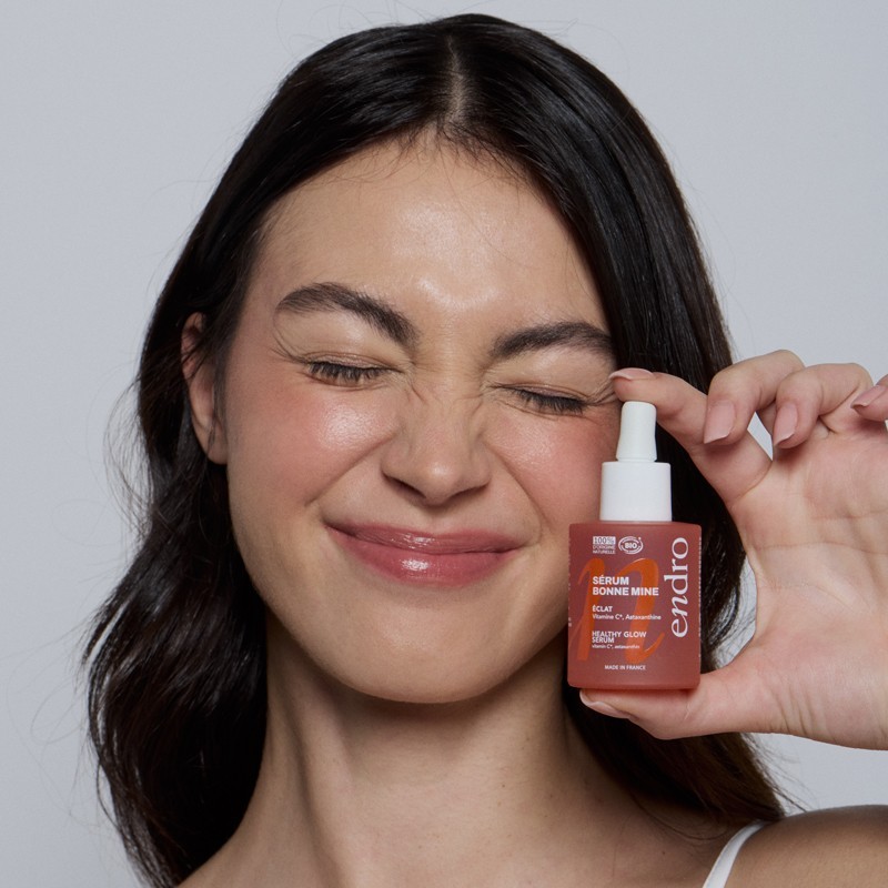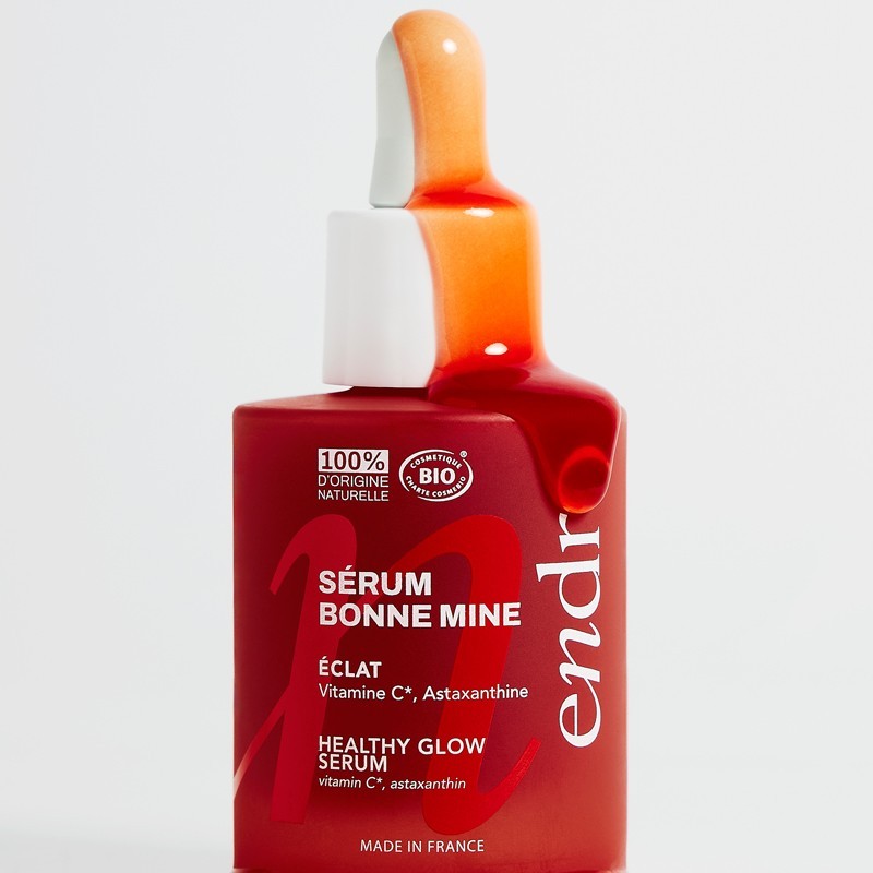 Siero illuminante Bonne Mine Endro Cosmétiques con vitamina C stabilizzata e astaxantina. Dona un effetto luminoso immediato e aiuta a uniformare il colorito delle pelli con incarnato spento. Texture gel acquosa, 100% di origine naturale.