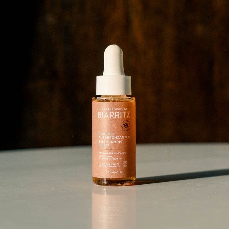 Gocce autoabbronzanti bio Laboratoires de Biarritz. Da miscelare al trattamento quotidiano per un colorito progressivo, naturale e modulabile. Con Alga-Gorria® antiossidante, aloe vera e glicerina bio.
