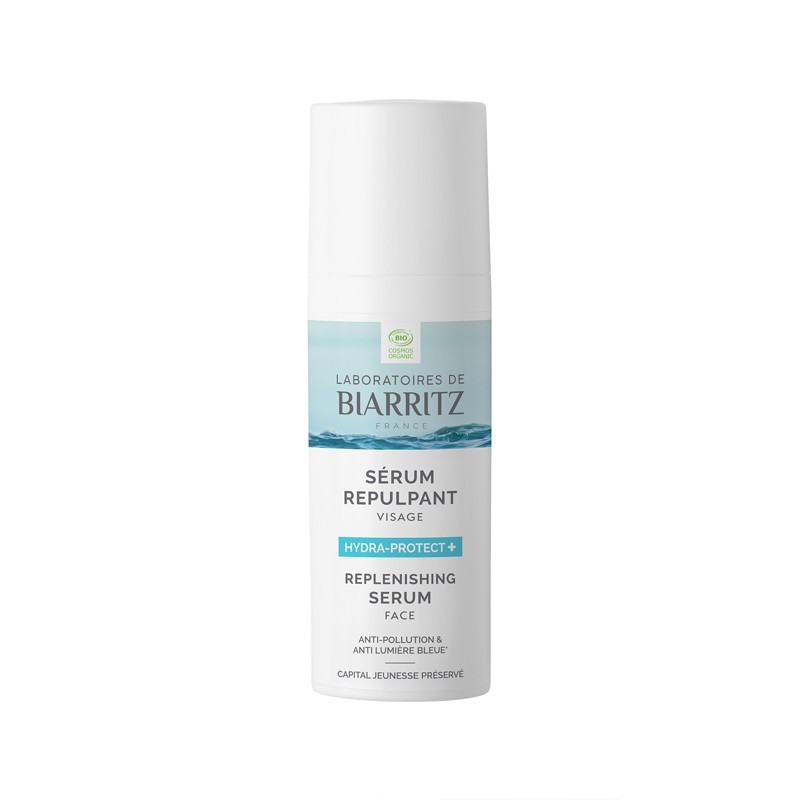 Siero rimpolpante Hydra-Protect+ Laboratoires de Biarritz. Booster multi-attivo di idratazione 24h con Alga-Gorria®, Extremolyte, acido ialuronico e complesso di polisaccaridi. Texture leggera effetto “seconda pelle”.